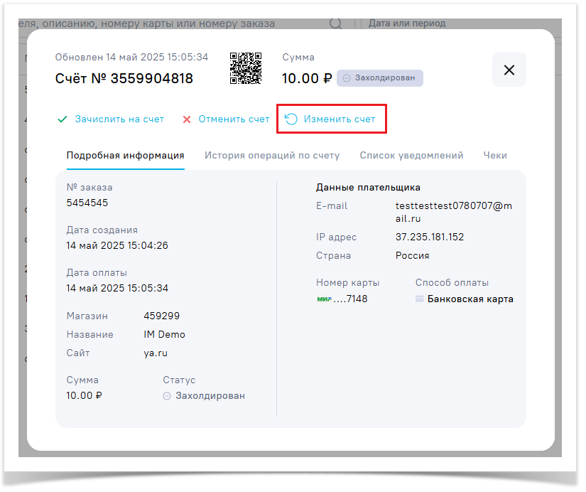 Для этого зайдите в счет, по которому необходимо произвести расхолдирование средств, и нажмите на кнопку Изменить счет
