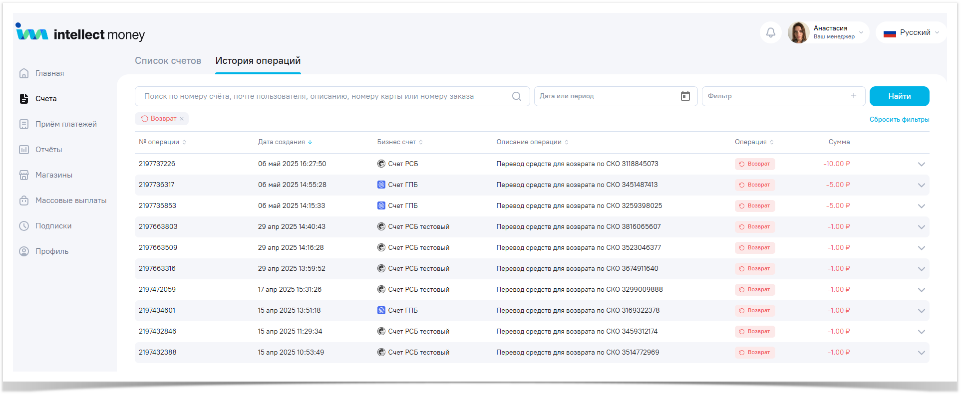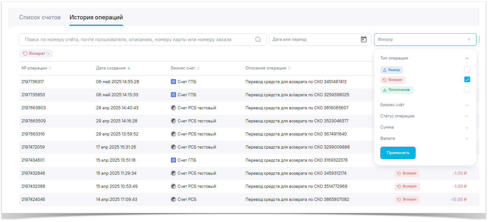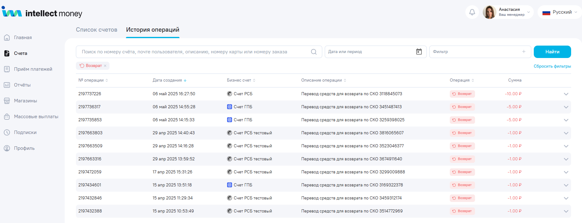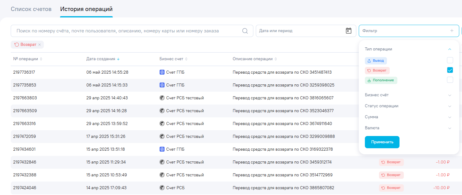Посмотреть историю возвратов можно в разделе "Счета" на вкладке "История операций"