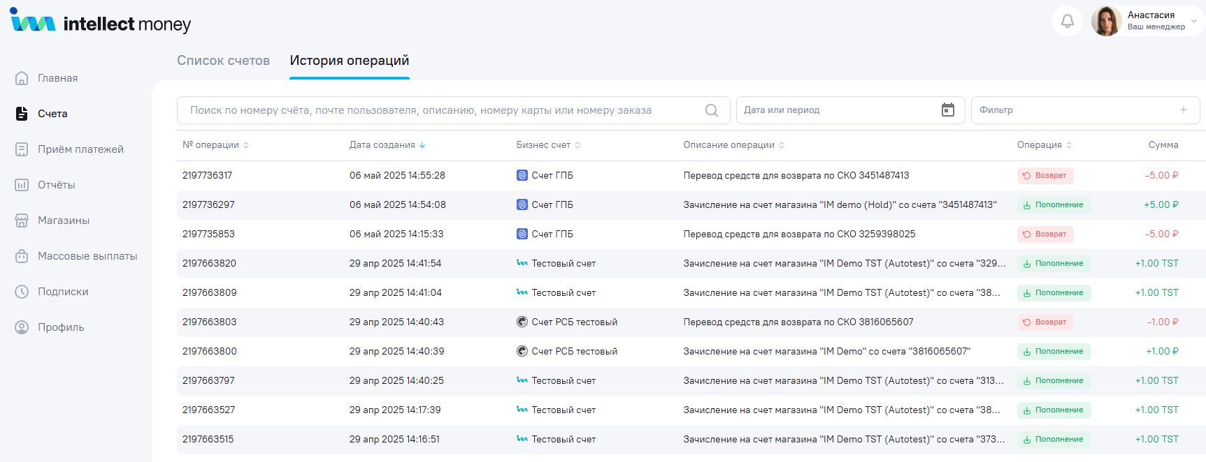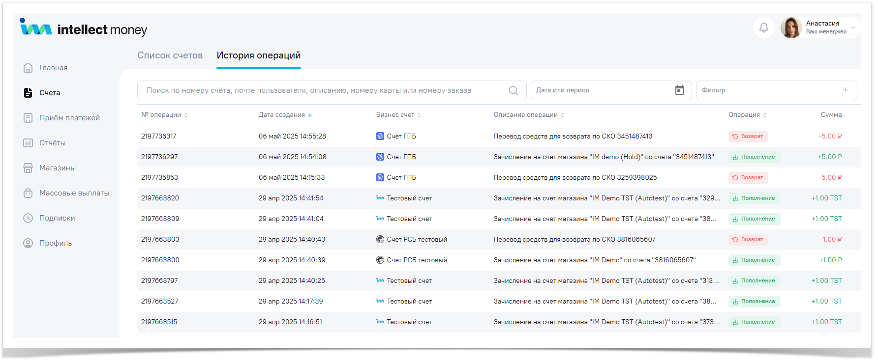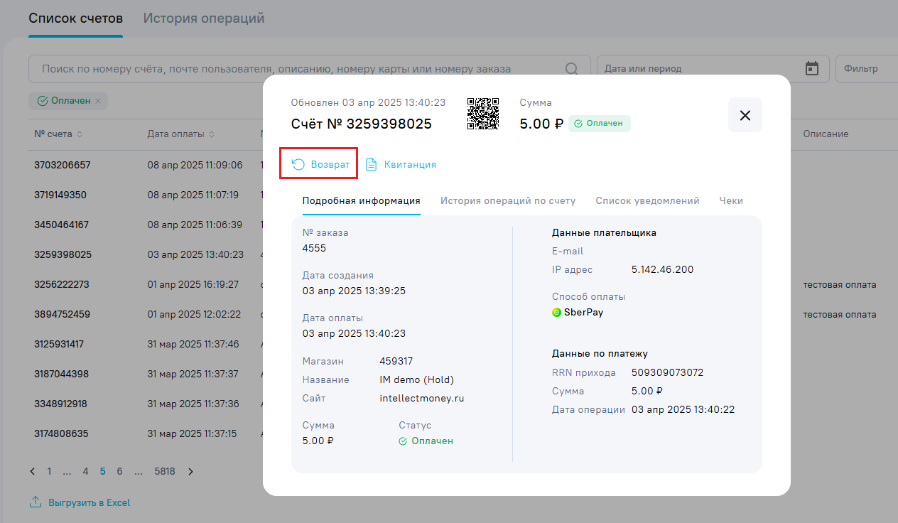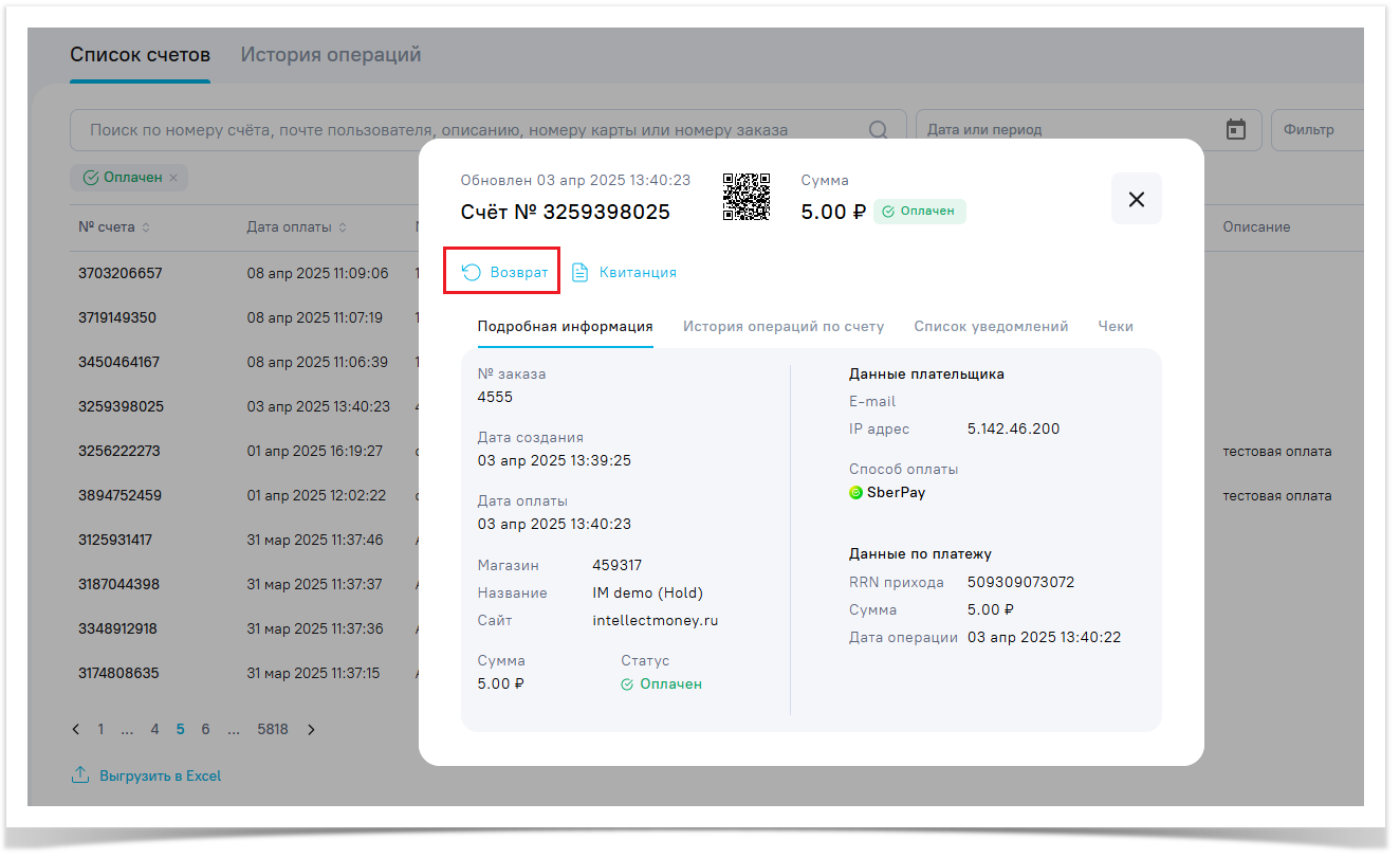 Посмотреть историю возвратов можно в разделе "Счета" на вкладке "История операций"