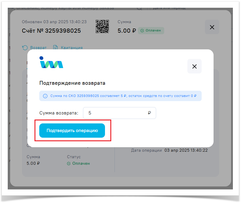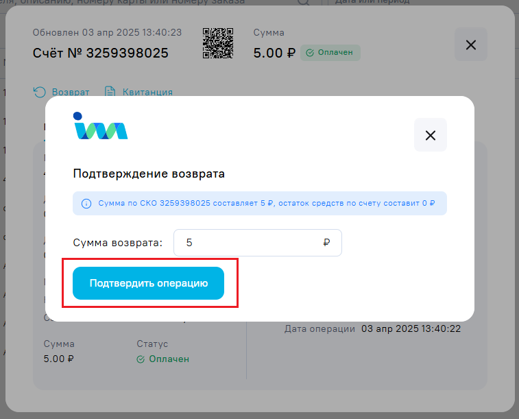 Откроется окно подтверждения, в котором нужно ввести сумму возврата плательщику и подтвердить возврат нажатием на кнопку Подтвердить операцию