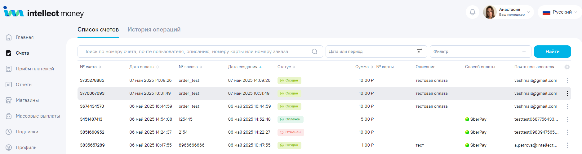 Для осуществления возврата плательщику перейдите в раздел "Счета" и выберите счет, денежные средства по которому необходимо вернуть, нажав на три точки справа: