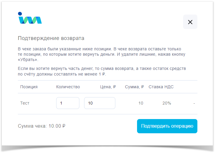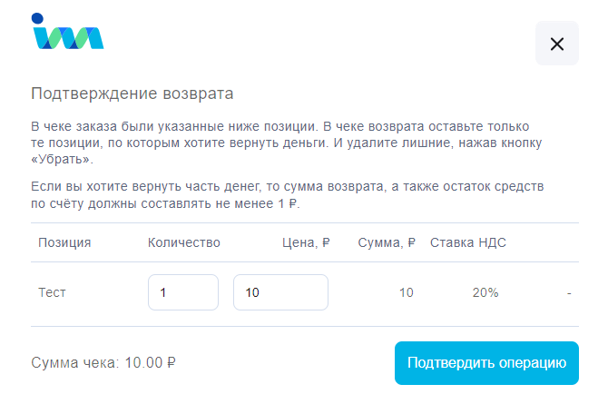 Можно изменить количество товара или стоимость. В чеке нужно оставить только те позиции, по которым необходимо сделать возврат. После корректирования данных нажмите кнопку Подтвердить операцию.