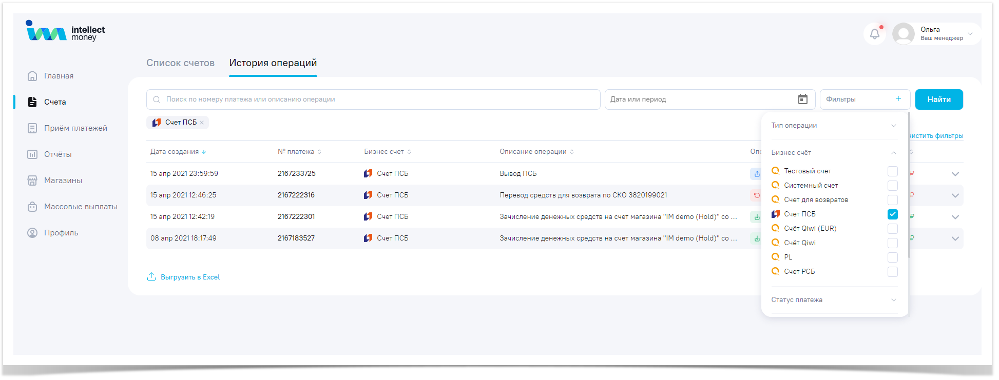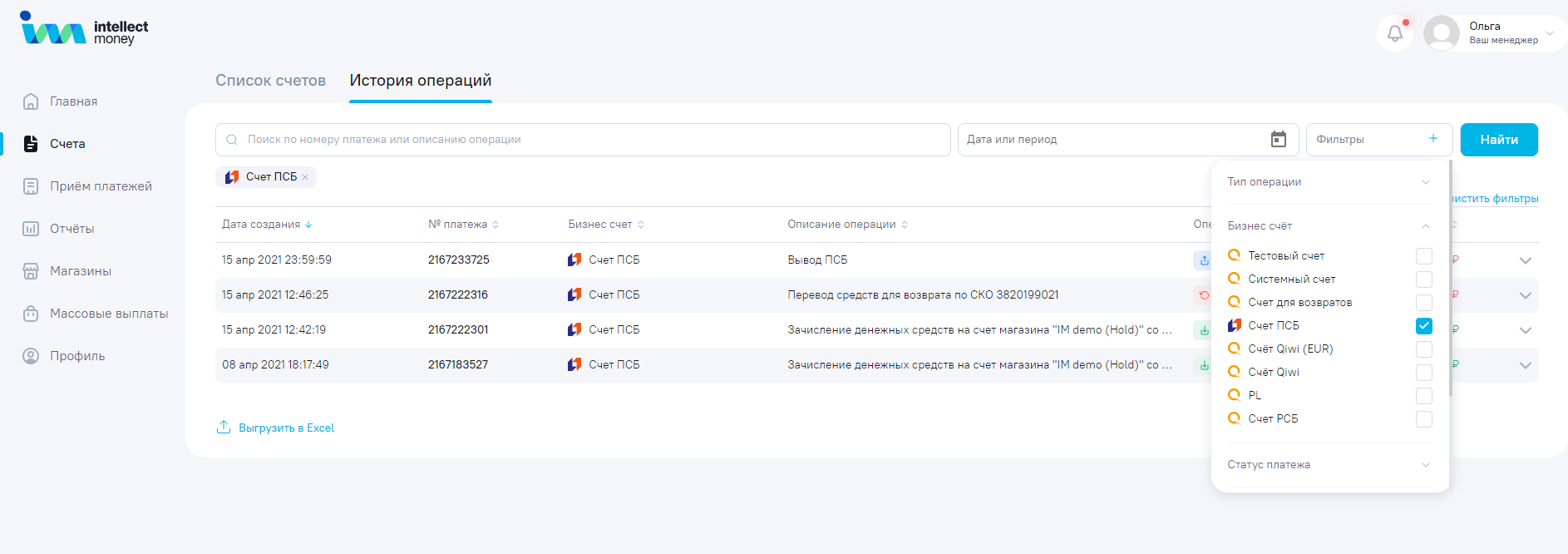 Организация может выгрузить историю операций по платежам в личном кабинете IntellectMoney. Для этого необходимо зайти в раздел "Счета", выбрать "История операций" , далее - в верхнем правом углу настроить фильтр, где нужно выбрать необходимый бизнес счет, также можно выбрать период . После нажатия кнопки "Найти" появится список операций. Список можно выгрузить нажав кнопку - "Выгрузить в exel" (находится слева внизу страницы).После добавления файла в очередь, его можно выгрузить, нажав вверху справа на колокольчик.