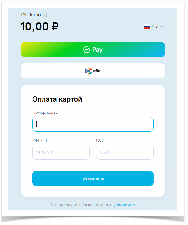 Для оплаты счета пользователь направляется на платежную страницу, где отображаются все доступные способы оплаты: