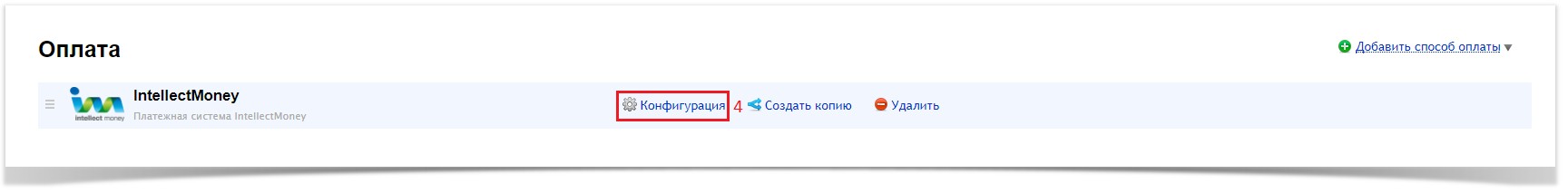 - На строке "IntellectMoney" нажмите ссылку "Конфигурация"