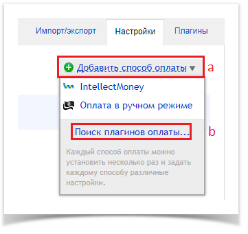 - В выпадающем меню нажмите на ссылку "Поиск плагинов оплаты"