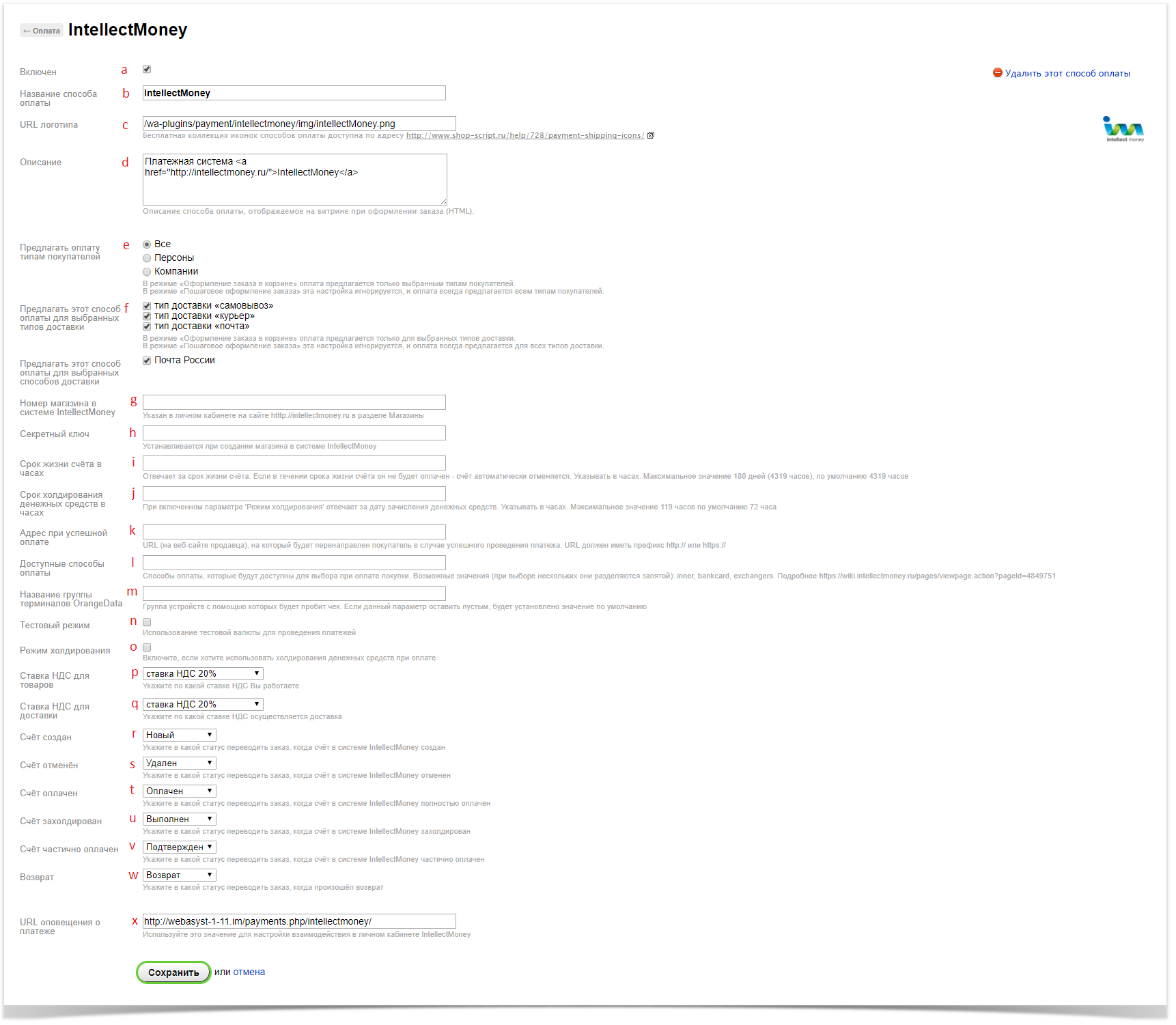 - * Счёт оплачен - укажите в какой статус переводить заказ, когда счёт в системе IntellectMoney полностью оплачен