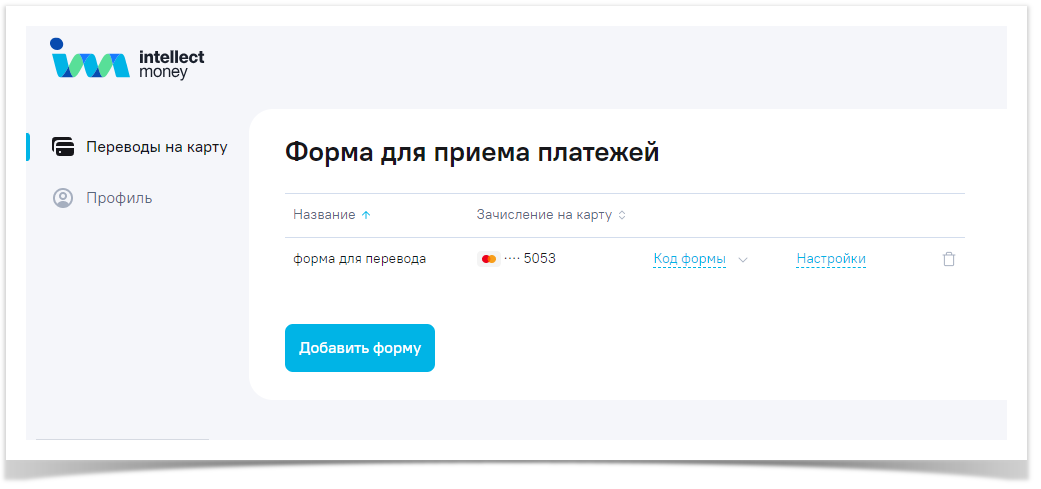 Раздел «Переводы на карты» вкладка «Форма для приема платежей» ведет к списку сохраненных форм. Здесь можно нажать «Код формы» и разместить полученный код на своём сайте или в социальной сети.