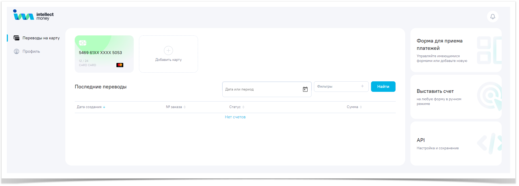 Укажите карту , на которую вы хотите принимать платежи (можно использовать несколько карт). - Выставляйте счет на оплату или создайте форму для приема переводов