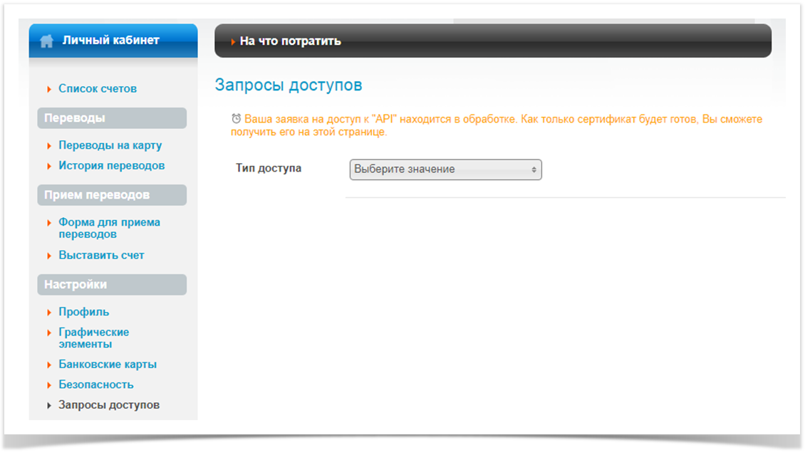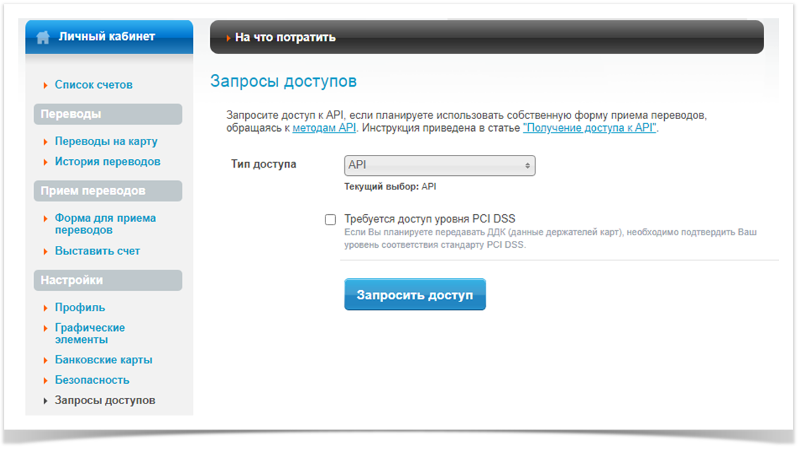 4. Запросить доступ к API. Для этого необходимо в разделе «Настройки» нажать вкладку «Запросы доступов». В открывшемся окне выбрать Тип доступа API и нажать кнопку «Запросить доступ»