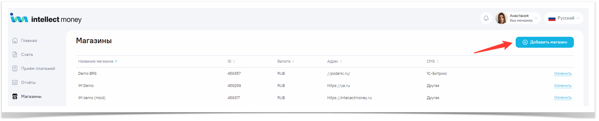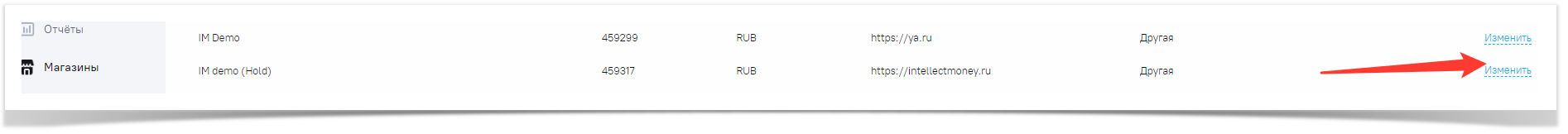 Если у вас уже есть действующий магазин, выберите в меню раздел "Магазины" и нажмите на кнопку "Изменить".