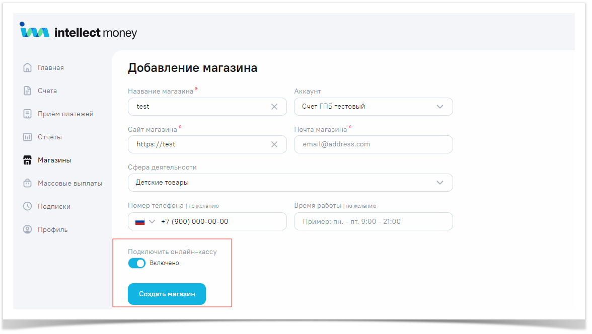 После внесения информации нажмите на кнопку "Подключить онлайн-кассу" и создайте магазин.