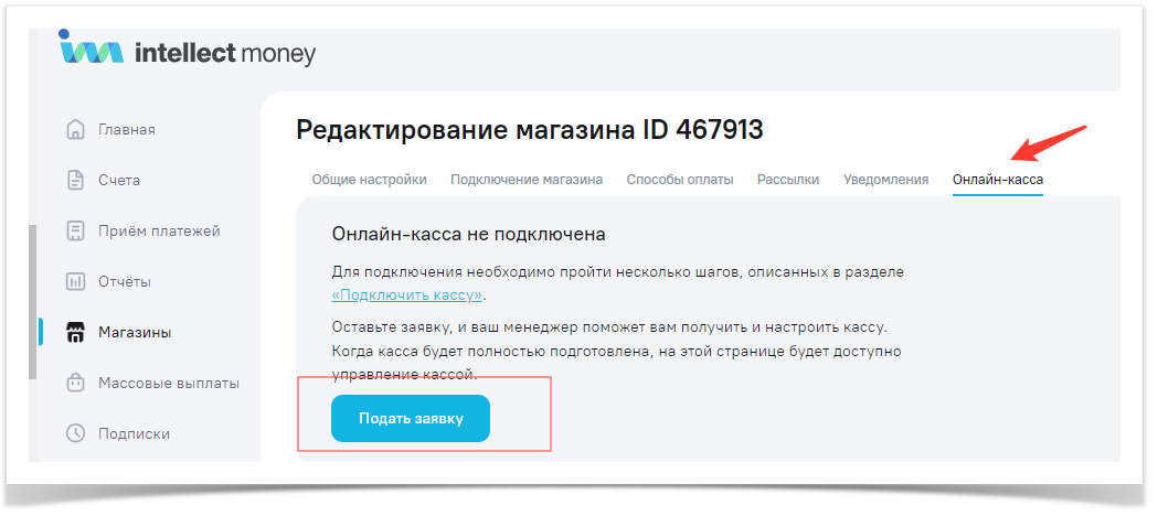 1. Убедиться в том, что у вас подписан договор с IntellectMoney и оставить заявку на подключение онлайн-кассы.