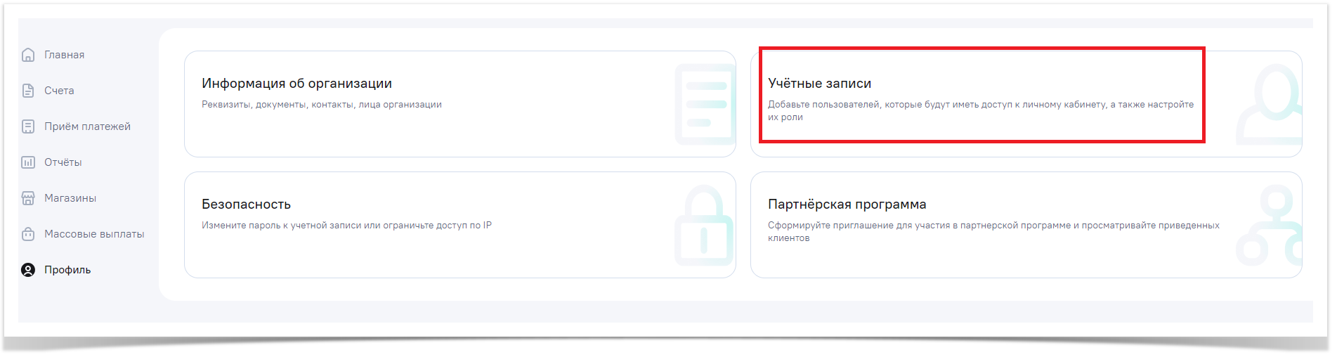 Для заведения новой учетной записи необходимо зайти в личный кабинет IntellectMoney, выбрать слева раздел "Профиль" и нажать на вкладку "Учётные записи"