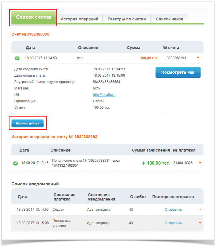 Так, как платеж совершен с помощью не моментального способа, то зачисление произойдет в течении 5 рабочих дней. | Отслеживать успешную оплату возможно одинаково через личный кабинет для всех счетов. Если Вам необходимо сразу фиксировать случаи успешной оплаты, попробуйте отключить не моментальные способы оплаты, оставив только моментальные. |
