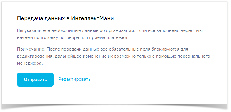 После заполнения реквизитов, свяжитесь с менеджером курирующим вашу организацию по тел. +7 495 649 86 65 или e-mail: pro@intellectmoney.ru., для получения на подпись заявление на присоединение.
