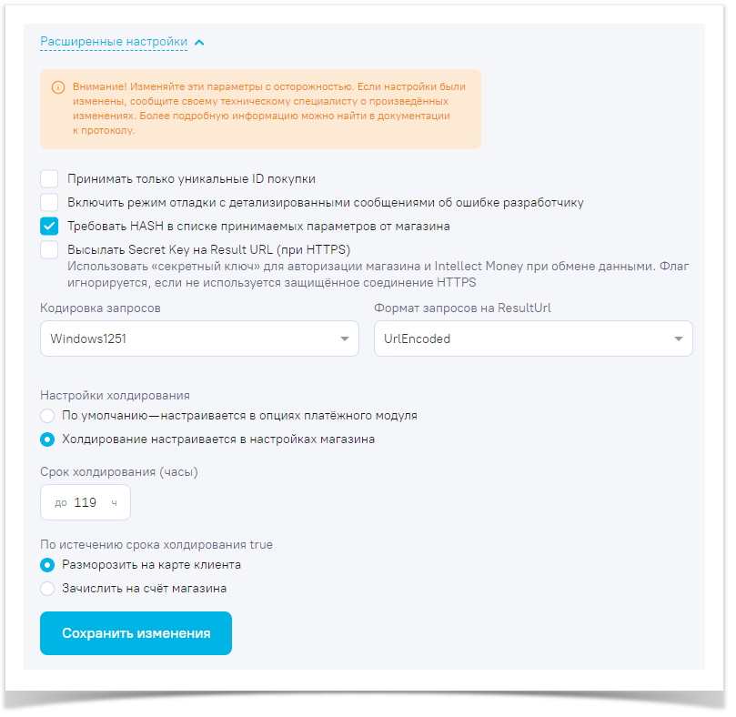 | Настройки холдирования | Определяет возможность управлять настройками режима холдирования либо с помощью модуля CMS, либо с помощью личного кабинета Intellectmoney, принимает два значения: