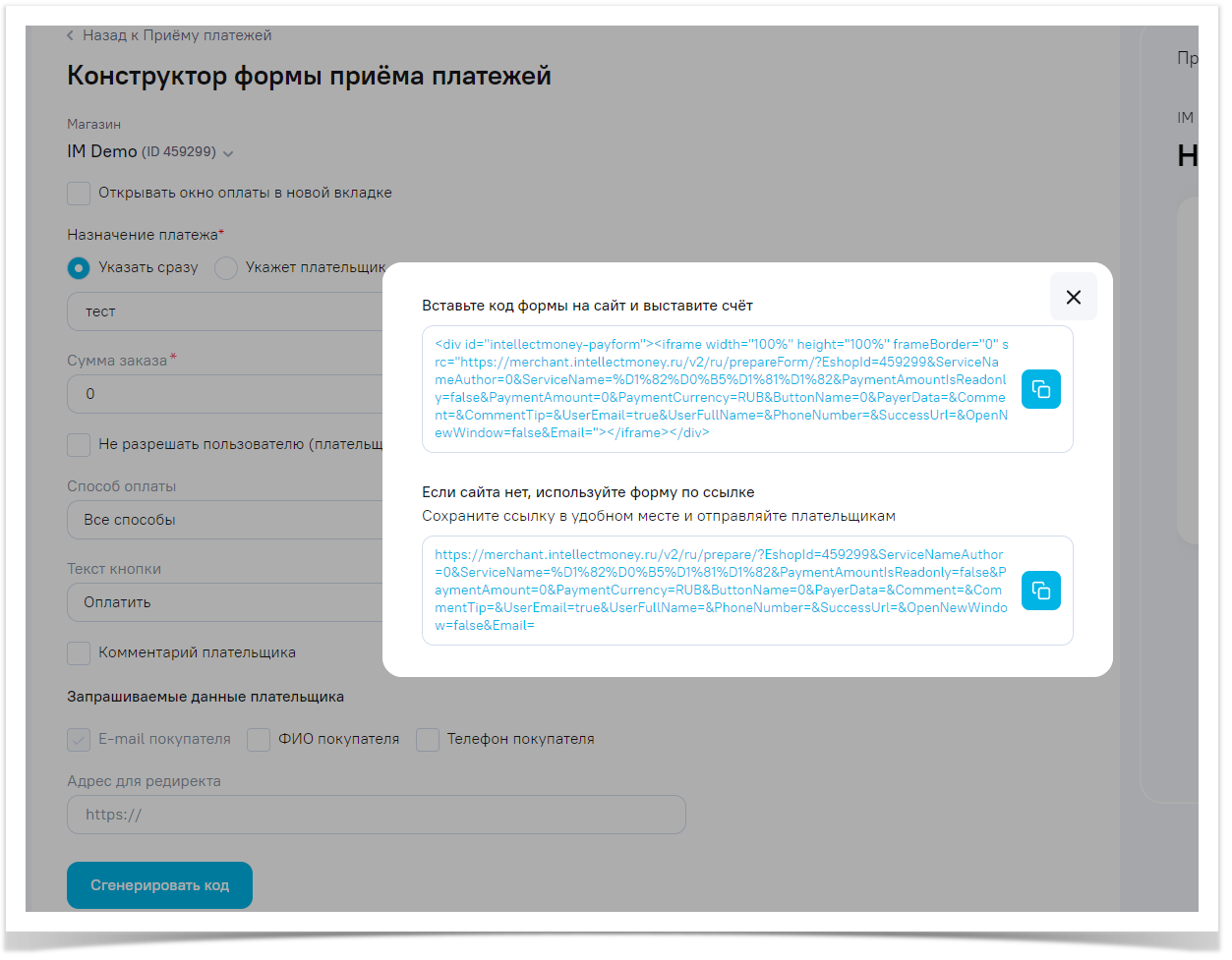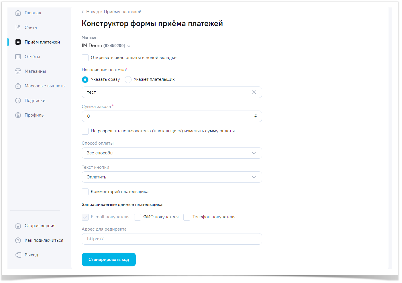 Далее заполняем все необходимые поля и нажимаем на "Сгенерировать код".