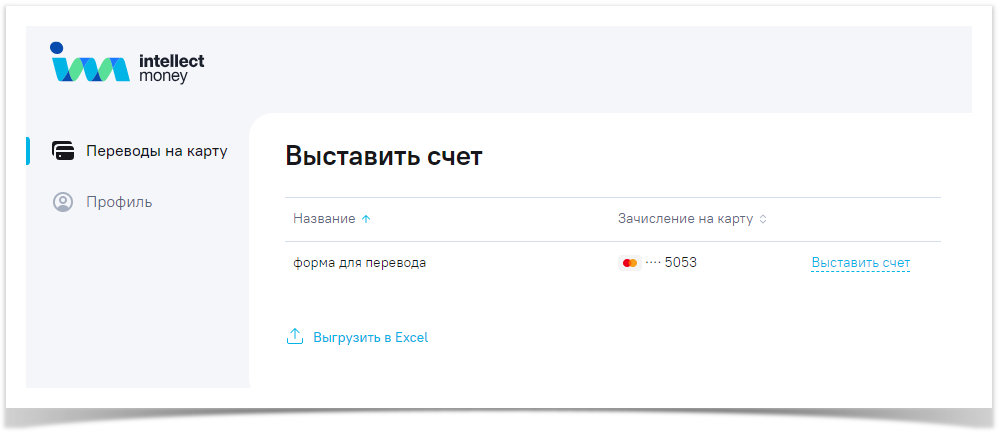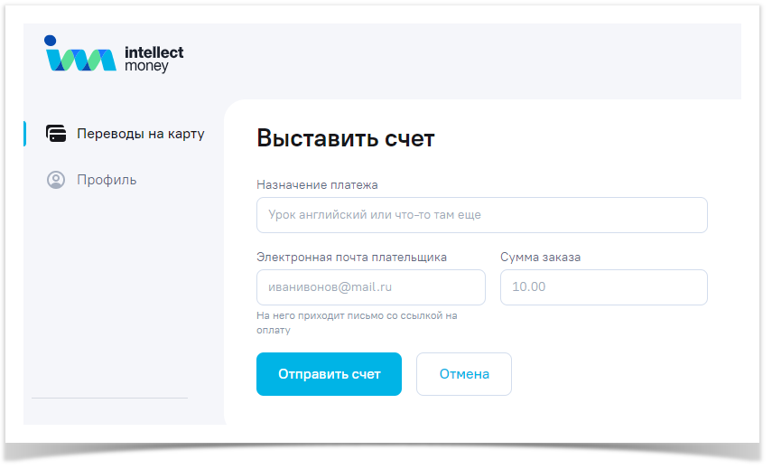 Для выставления счёта достаточно в разделе «Переводы на карту» нажать на вкладку «Выставить счет», выбрать форму, на которую он будет выставляться, заполнить данные и отправить счёт на нужный электронный адрес.